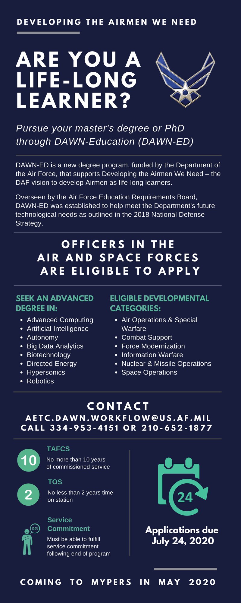 Developing the Airmen We Need-Education (DAWN-ED) is a new degree program, funded by the Department of the Air Force that supports DAWN – the DAF vision to develop Air and Space Professionals as life-long learners.
